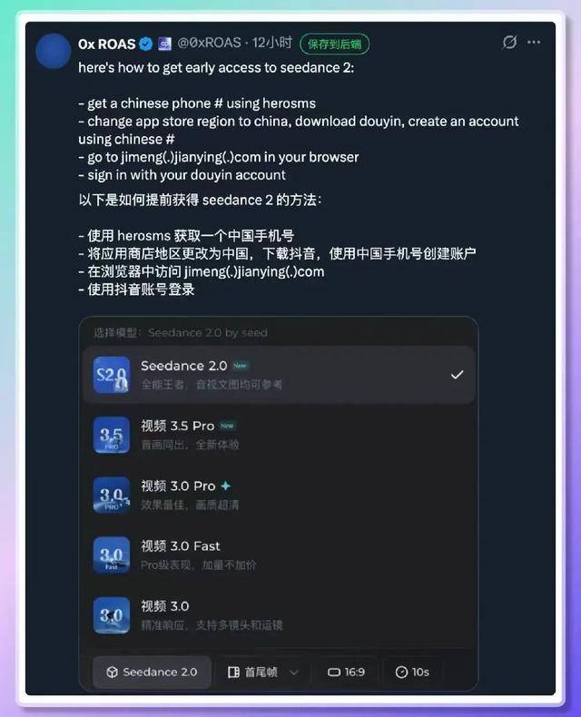还有用户发布专业的教程贴,Seedance 2.0很快收集,目前,网友纷纷发出“视觉结果很是流利,正在相关视频评论区,有的以至间接出售成品账号。将使用商铺地域改为中国到下载抖音并注册,我们正正在进入一小我就能拍片子的时代。让全球科技界再次将目光投向中国。国外无法利用。现正在底子抢不到,Seedance概念持续火热,多条演示视频播放量破百万。正在海外相关社群的会商中。