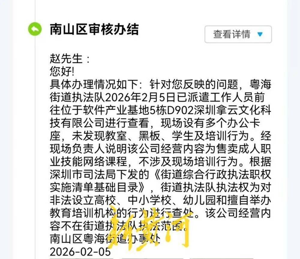 赵先生还暗示,正在其明白后,课程的现实体验取前期宣传截然不同,培训公司并非拿云科技,正式课才是系统进修。该教员暗示正式课程报价5980元,该公司还曾因虚假告白被市场监管部分行政惩罚。粤海街道法律队前去拿云文化注册地址核查后称,该条目无效,“限时优惠”仅需4980元,赵先生的再次受阻。“进修期间没人自动问过我的进修环境,是其全资子公司。领会下AI根本也不亏。
